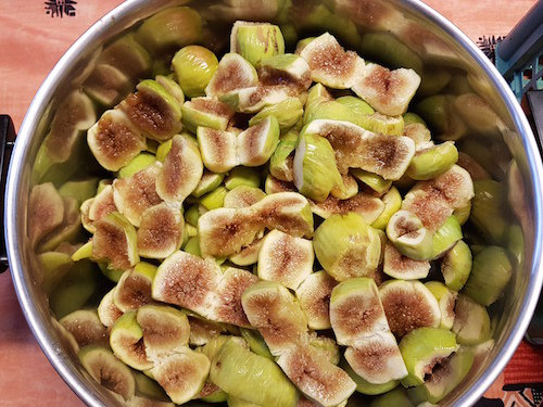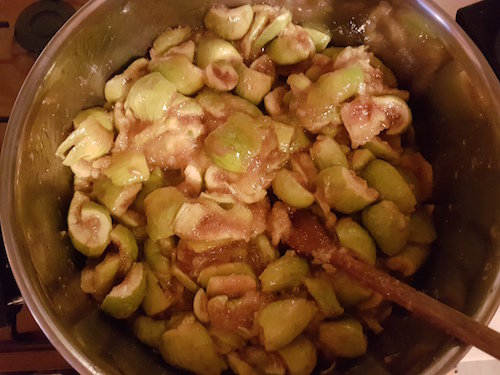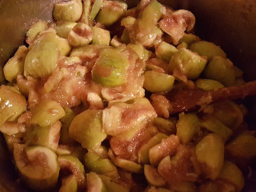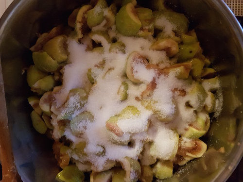 3. Mettere in una casseruola i fichi precedentemente tagliati a metà, aggiungere lo zucchero e iniziare la cottura. A fuoco basso per evitare che si attacchi al fondo.